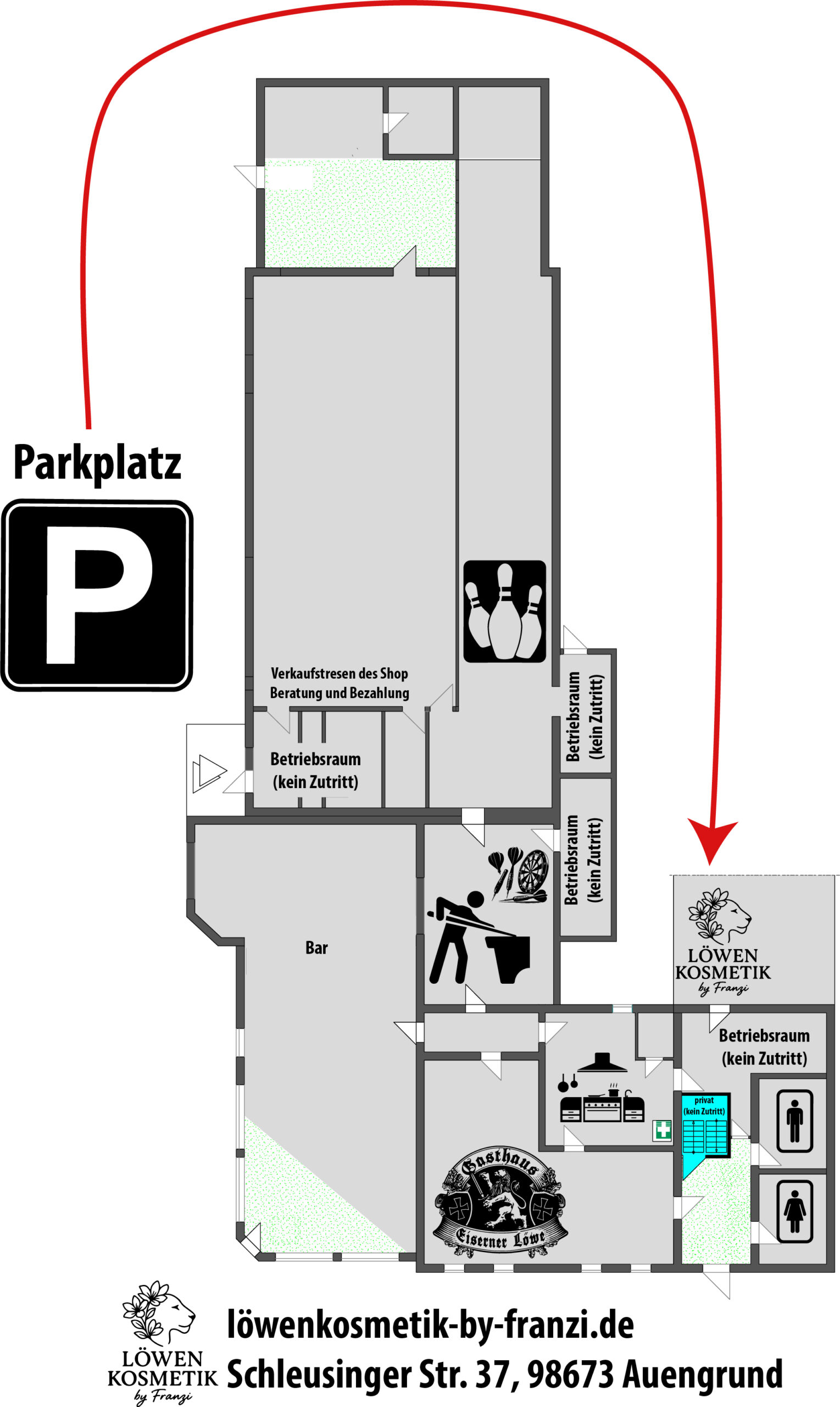 Vom Parkplatz aus bitte hinter das Gebäude gehen – dort befindet sich der Eingang zum Studio (siehe roter Pfeil auf dem Plan).